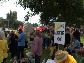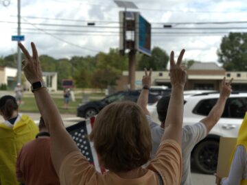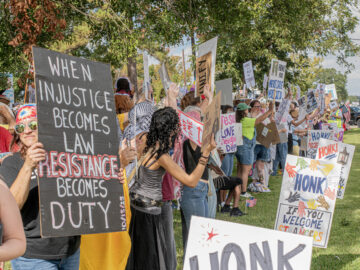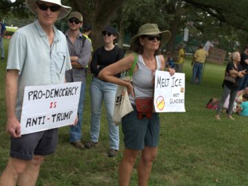Nearby, John Pojman said he came to show support for democracy itself. “It’s a scary time when people are worried about peacefully protesting and expressing their opinions, and we have to stand up,” he said. “That’s why I’m here.” His takeaway from the day: “There’s just a lot of good people who are concerned about the future of our country.”