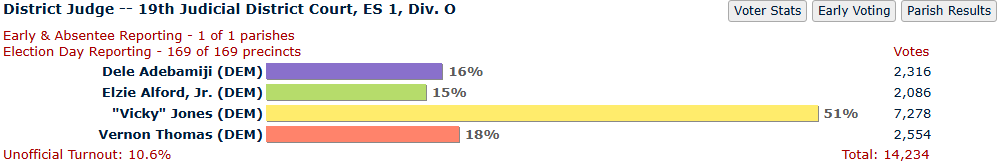 In the special election to replace Judge Wilson Fields, who vacated his post to join the First Circuit Court of Appeal, Vicky Jones secured the win with 51 percent of the vote, defeating Vernon Thomas (18 %), Dele Adebamiji (16 %), and Elzie Alford Jr. (15 %).