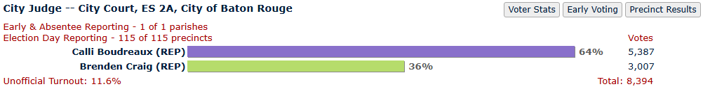 In the City Court, Division A race, Calli Boudreaux defeated Brenden Craig by a commanding 64-to-36 margin. Both candidates ran as Republicans — a rarity in heavily Democratic Baton Rouge — and that dynamic appeared to suppress participation further, particularly among Black voters.