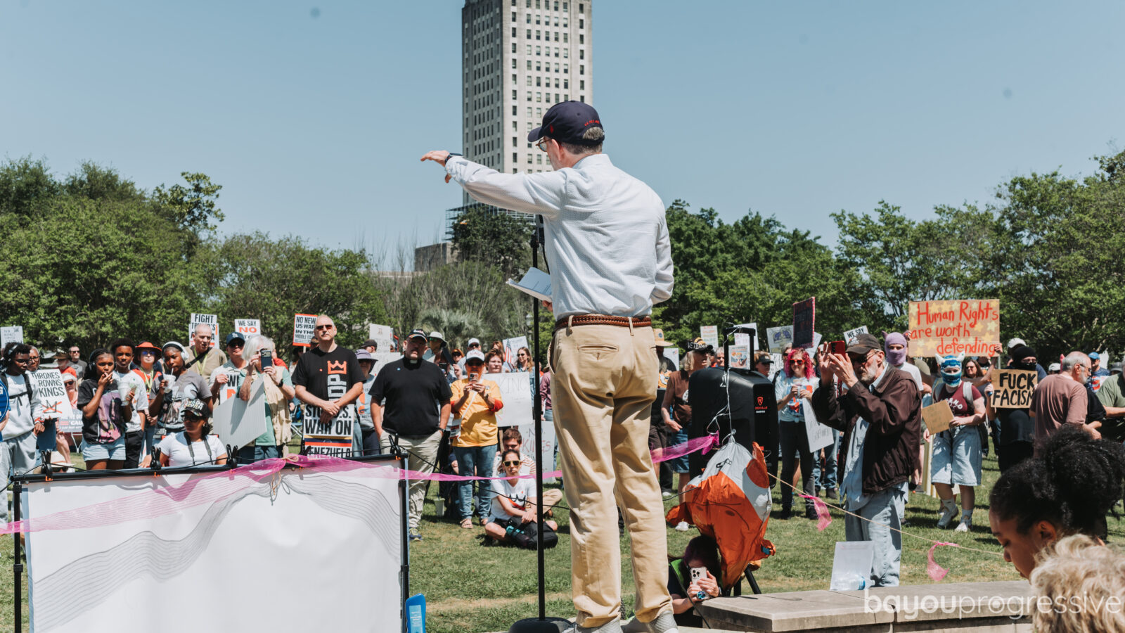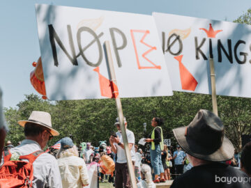 The Baton Rouge event was one of multiple Louisiana demonstrations connected to Saturday’s “No Kings” actions, which were promoted nationally through Indivisible and allied groups as a rejection of authoritarian politics, attacks on immigrants, and broader threats to democratic rights. Public event listings described the local protest with the same core slogan used nationwide: “No Thrones. No Crowns. No Kings.”
